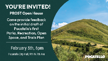 The City of Pocatello invites you to an open house regarding the creation of Pocatello’s first Parks, Recreation, Open Space & Trails (PROST) Plan. The meeting will be held Wednesday, February 5 at 6 p.m. in the City Hall Council Chambers, 911 North 7th Avenue, Pocatello, ID.